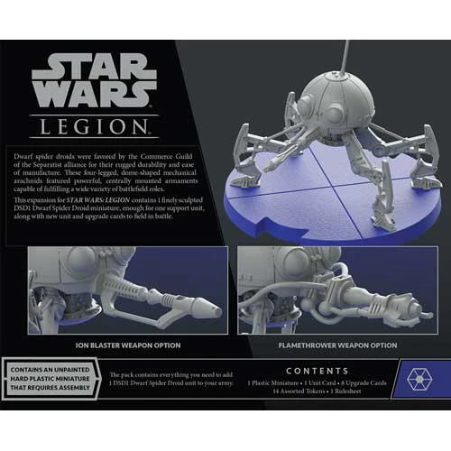 Within this expansion, you’ll find everything you need to add a DSD1 Dwarf Spider Droid to your Separatist armies as a support unit. This droids versatile nature is captured in the finely detailed, unpainted hard plastic miniature that can be customized with a nose-mounted laser cannon, flamethrower, or ion blaster. These physical modifications have a practical application in eight upgrade cards that invite you to outfit your DSD1 Dwarf Spider Droid with a variety of weapons and battle protocols.