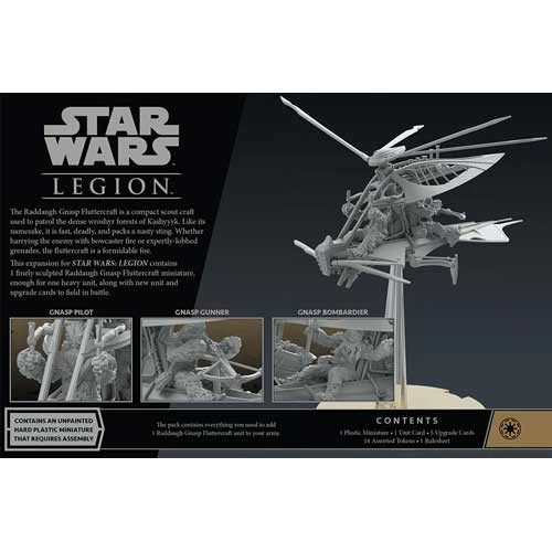 This expansion contains 1 finely sculpted Raddaugh Gnasp Fluttercraft miniature, enough for one heavy unit, along with new unit and upgrade cards to field in battle.