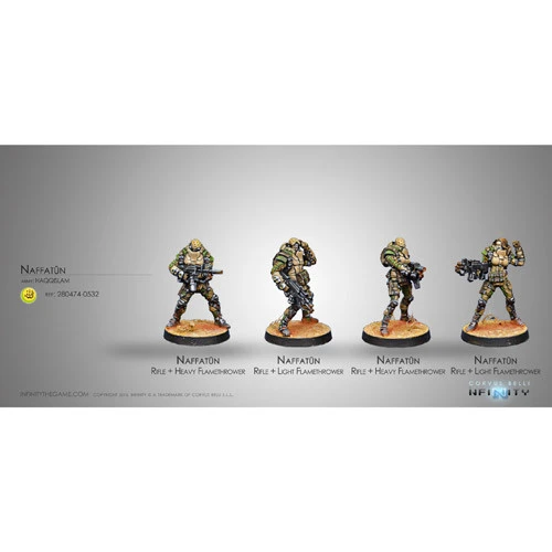 A new Infinity unit box that replaces the previously released blister. Armed with Flamethrowers plus a Rifle, the Naffatun are useful and cheap troops, perfect to defend the rearguard from enemy surprise attacks, but also to perform assaults or fight against camouflaged troopers. The versatile Naffatun will allow you to fight fire with fire!
