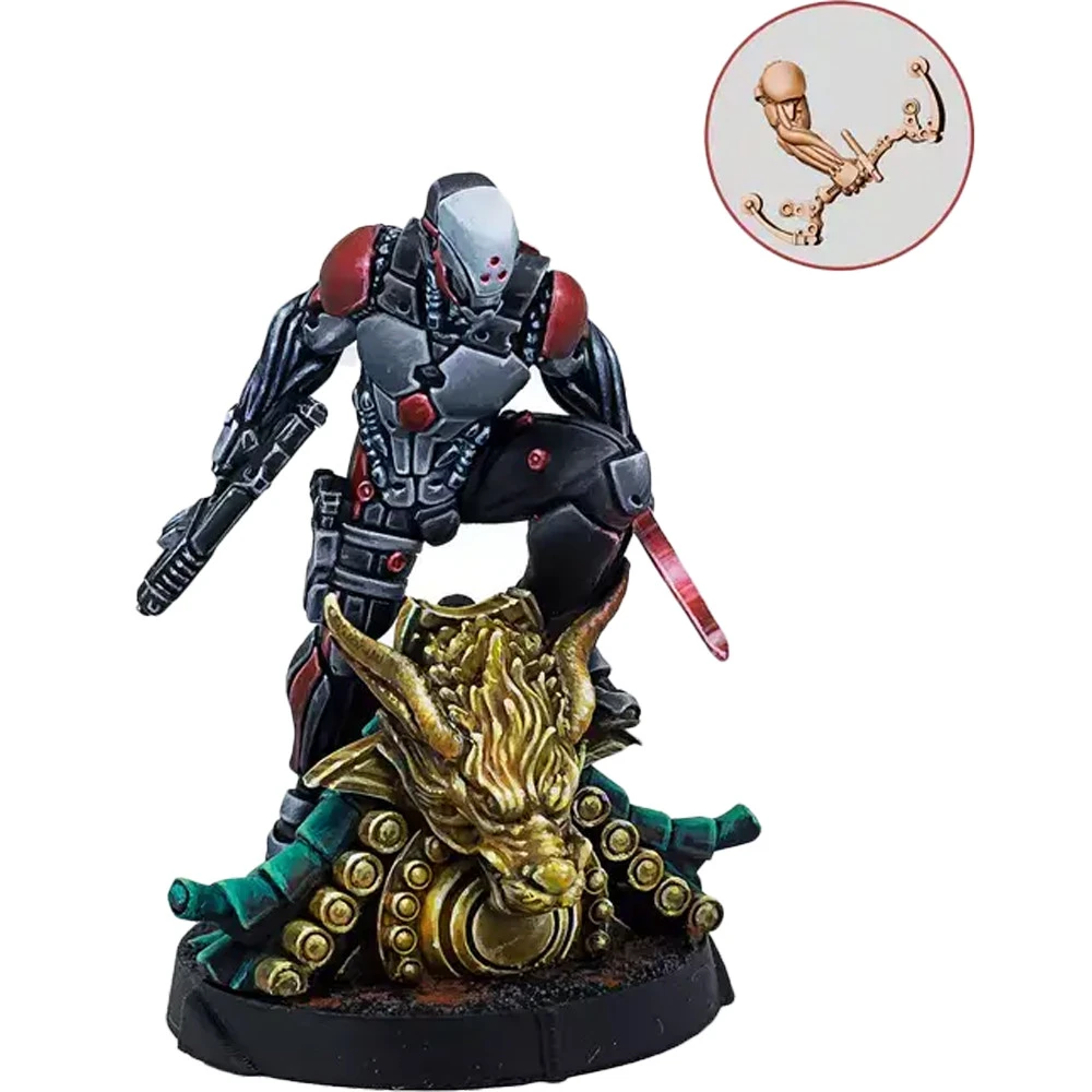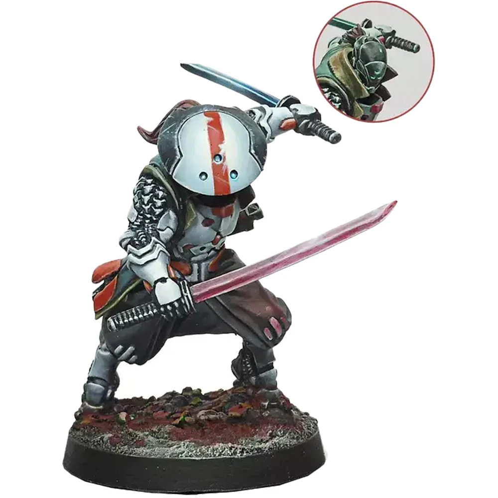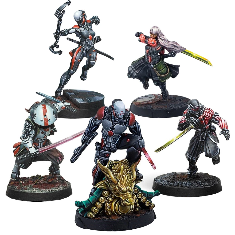 This box includes 5 miniatures: One Ninja with Submachine Gun, one Ninja with Tactical Bow, one Shikami with Combi Rifle, one Oniwaban with Monofilament CC Weapon and one Shinobu Kitsune with Monofilament CC Weapon. Shinobu Kitsune and the Shikami includes an extra alternative heads with hats. There are never enough ninjas on a list!